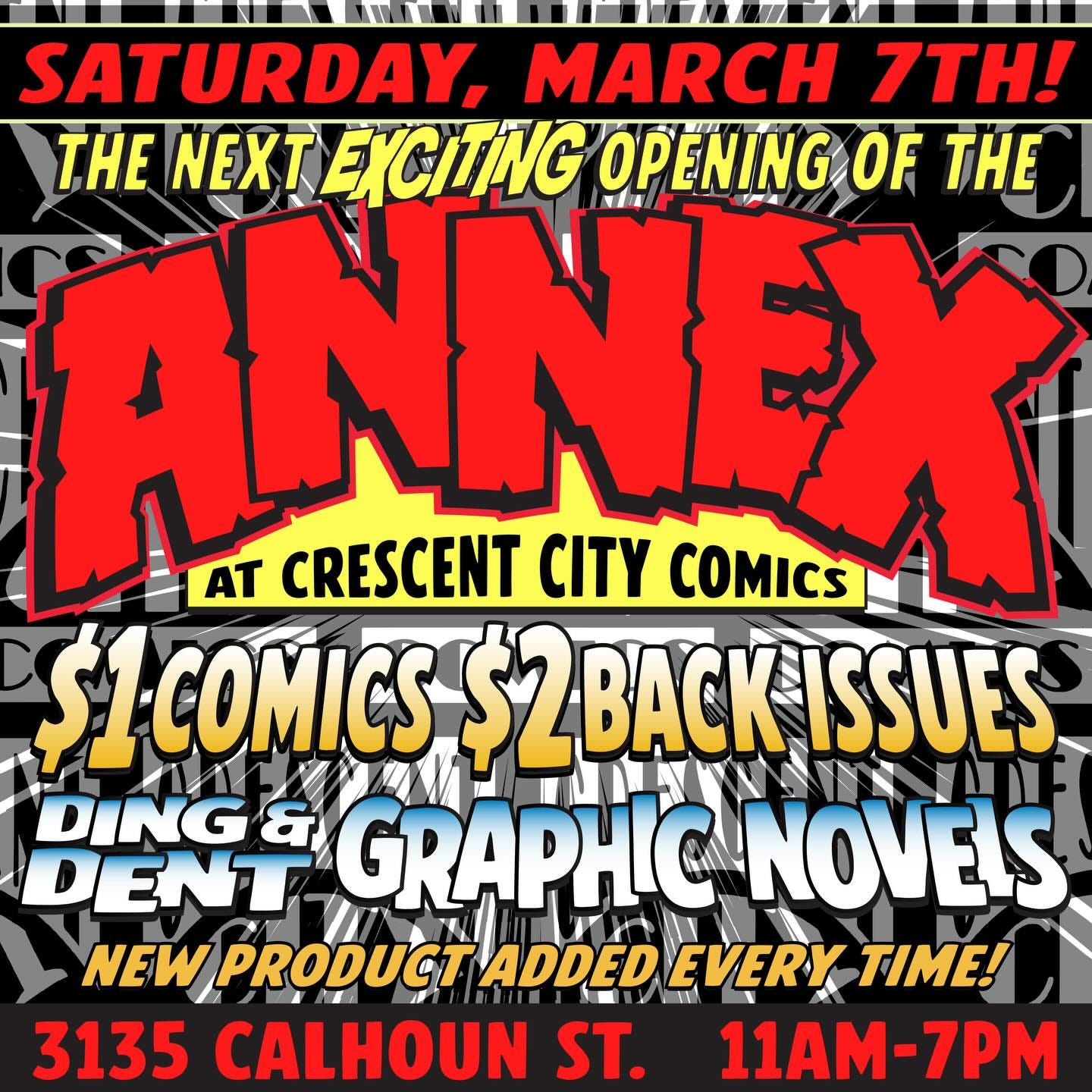 Crescent City Comics has thousands of $1 comics, and a good selection of discounted collected editions for sale on 3/7! Sometimes there’s even a box of toys out on a table or two. I try to go to each one of these they put on and then stop for coffee across the street. They have a handful of these sales a year! Check it out before the good stuff is gone!